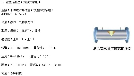 三角提楔式傳感器和一體化多變量智能型三角體楔式流量計(jì)是本公司研究開(kāi)發(fā)和生產(chǎn)的新型流量計(jì)。由于它采用了獨(dú)特的三家體楔塊(又稱三角體楔式傳感器)結(jié)構(gòu)設(shè)計(jì),突破了煉焦、煉油、化工等企業(yè)中的焦油、瀝青、殘?jiān)?、石蠟油、易結(jié)晶奈油等各種高粘度液體介質(zhì)的流量測(cè)量難題。