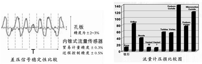 等速區(qū)域,符合伯努利定理,正壓信號穩(wěn)定,負(fù)壓孔位于錐體尾部中心,正好落在下游壓力最小的區(qū)域。由于錐體中心對稱的結(jié)構(gòu),使得負(fù)壓信號波動很小,輸出差壓信號非常穩(wěn)定,傳感器精度優(yōu)于讀數(shù)的士 0.5 % ,重復(fù)性為士 0.1 % ,貿(mào)易計(jì)量型精度高達(dá)士 0.3 %。(選擇合適的量程范圍)