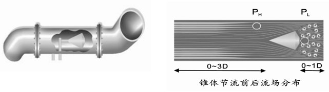當(dāng)介質(zhì)以一定的速度迎著錐尖方向流過時,由于錐體的節(jié)流作用,會使錐體下游立即形成低壓區(qū),通過錐體上游管壁取高壓PH,管壁與錐體尾部連通的空心管取低壓PL,送到差壓變送器,可測出差壓值△P。根據(jù)伯努利方程,可計(jì)算出流體的流速,再乘以管道截面積 S 和儀表系數(shù) K ,就可計(jì)算出體積流量qV 。