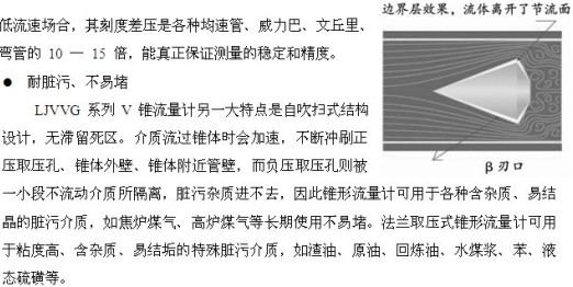 V錐流量計(jì)獨(dú)特的流線形錐體節(jié)流時具有“流線體邊界層效應(yīng)”,使臟污流體不會磨損節(jié)流緣,其β值可保證長期不變,整個儀表無可動部件,因此無需重復(fù)標(biāo)定,具有長期